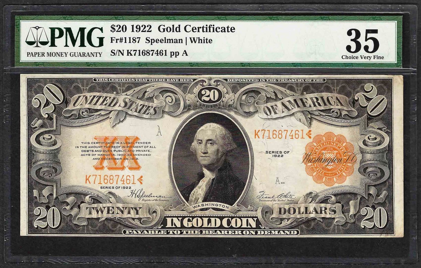 One 1922 $20 Gold Certificate Note Fr.1187 PMG Choice Very Fine 35. PMG Certified.