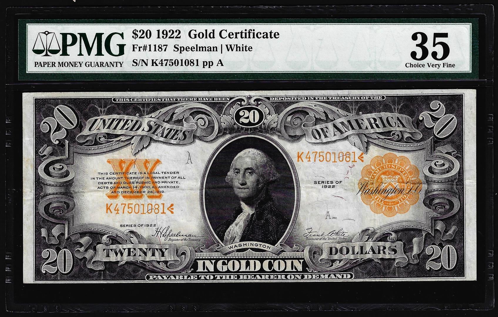 One 1922 $20 Gold Certificate Note Fr.1187 PMG Choice Very Fine 35. PMG Certified.
