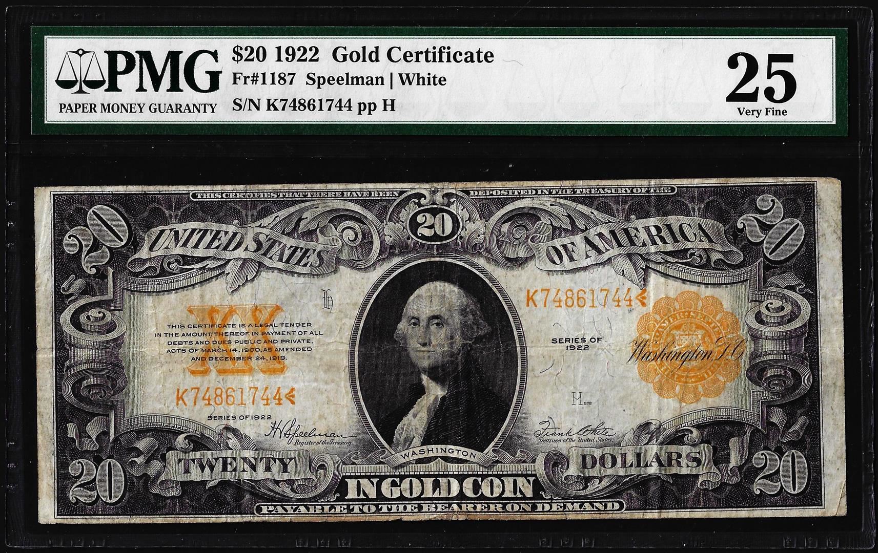 One 1922 $20 Gold Certificate Note Fr.1187 PMG Very Fine 25. PMG Certified.