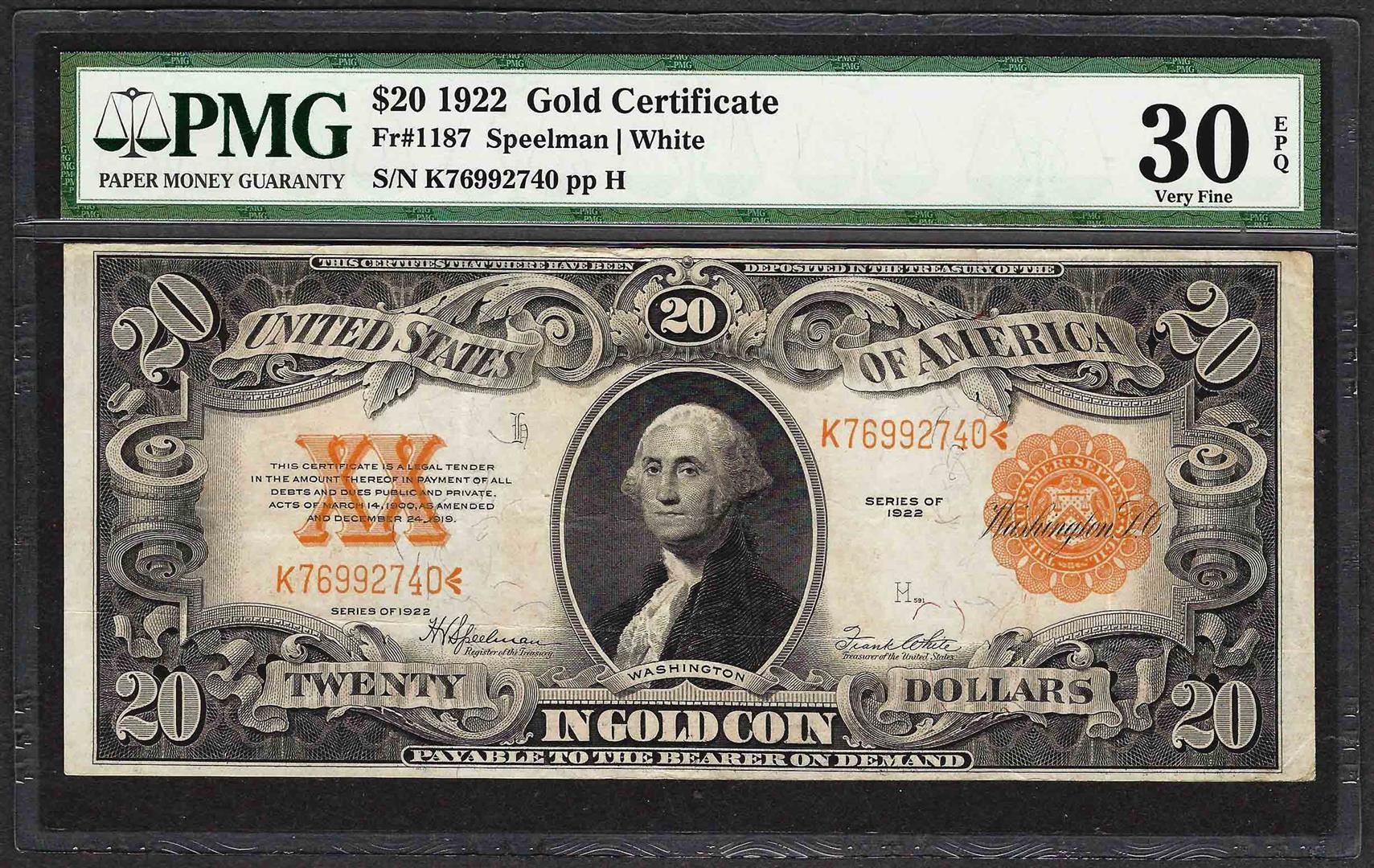 One 1922 $20 Gold Certificate Note Fr.1187 PMG Very Fine 30EPQ. PMG Certified.