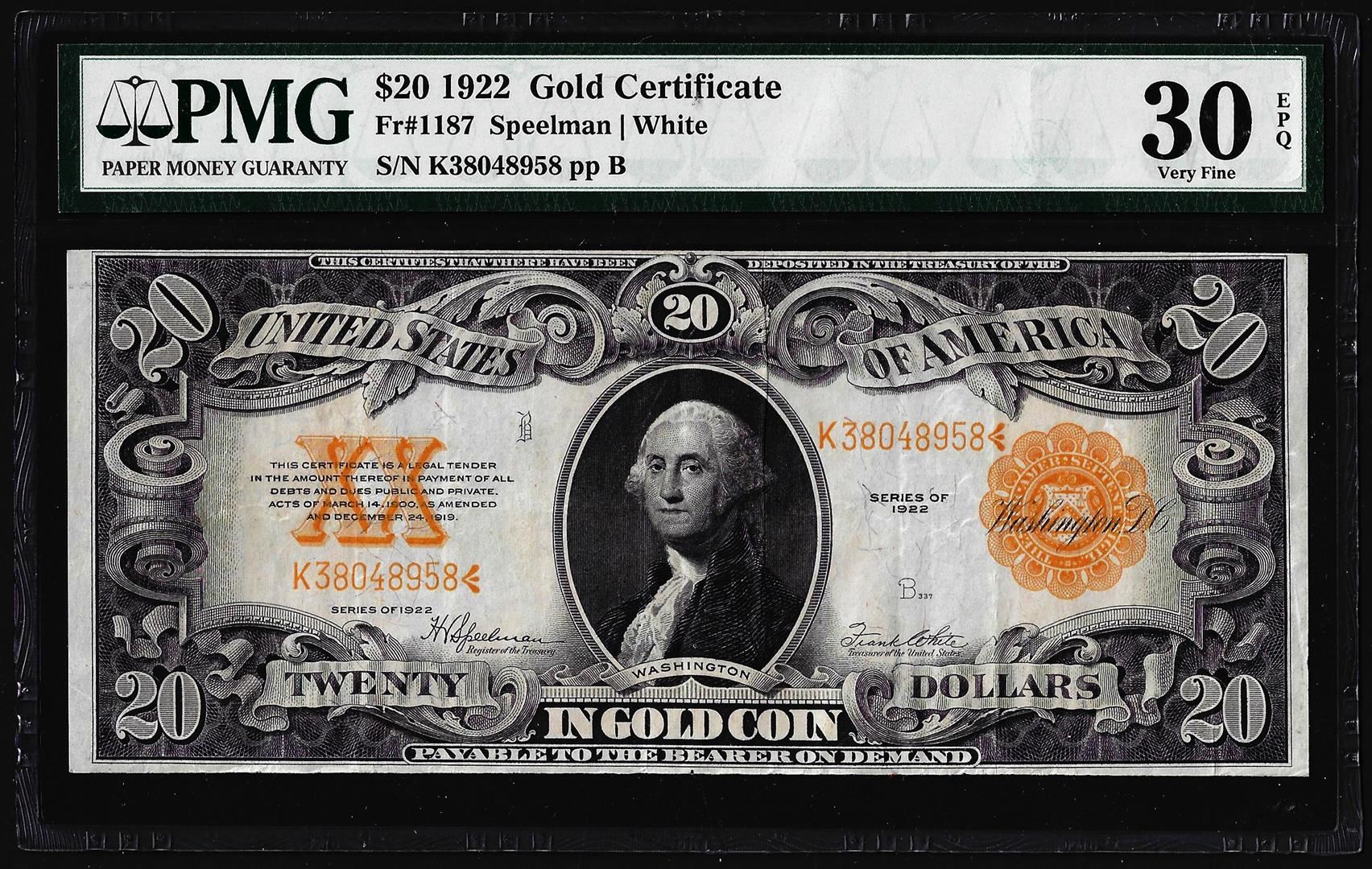 One 1922 $20 Gold Certificate Note Fr.1187 PMG Very Fine 30EPQ. PMG Certified.