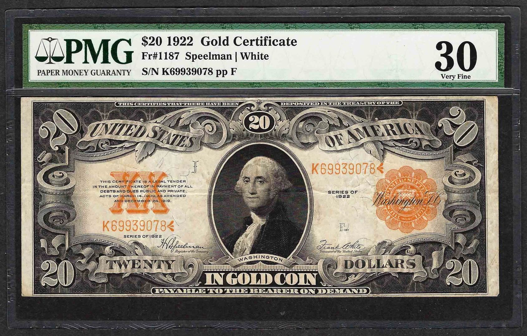 One 1922 $20 Gold Certificate Note Fr.1187 PMG Very Fine 30. PMG Certified.