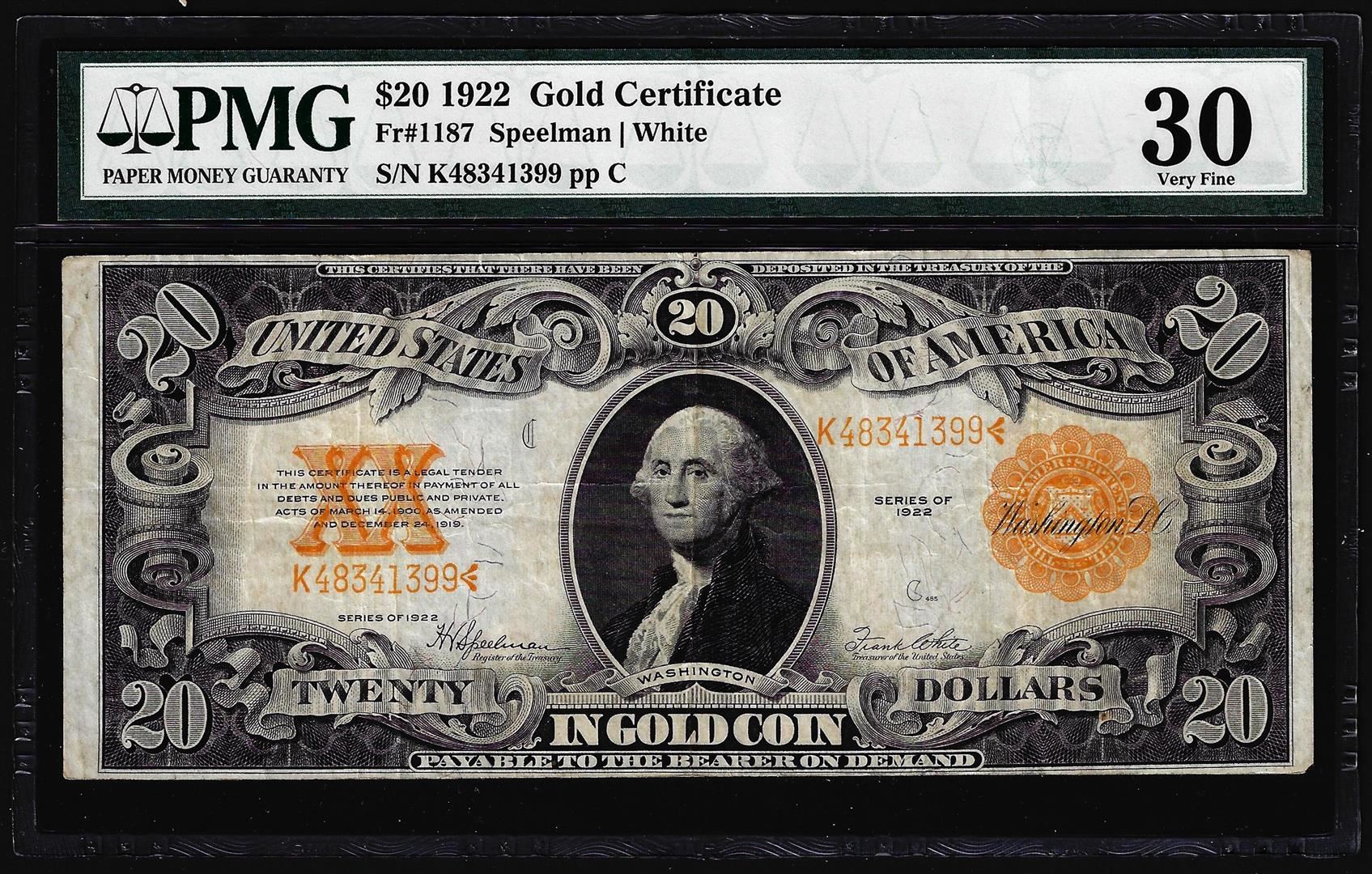 One 1922 $20 Gold Certificate Note Fr.1187 PMG Very Fine 30. PMG Certified.