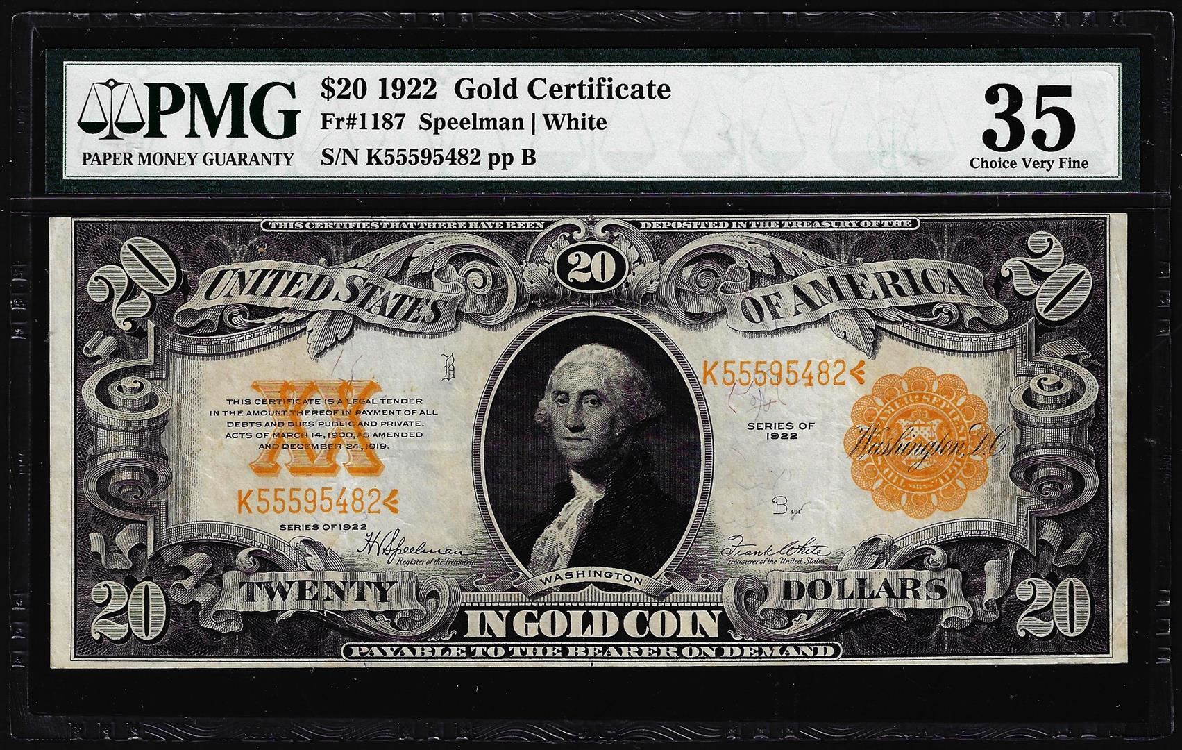 One 1922 $20 Gold Certificate Note Fr.1187 PMG Very Fine 35. PMG Certified.