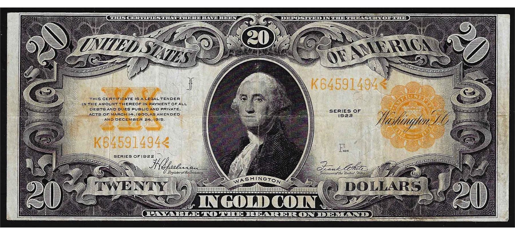 One 1922 $20 Gold Certificate Note.