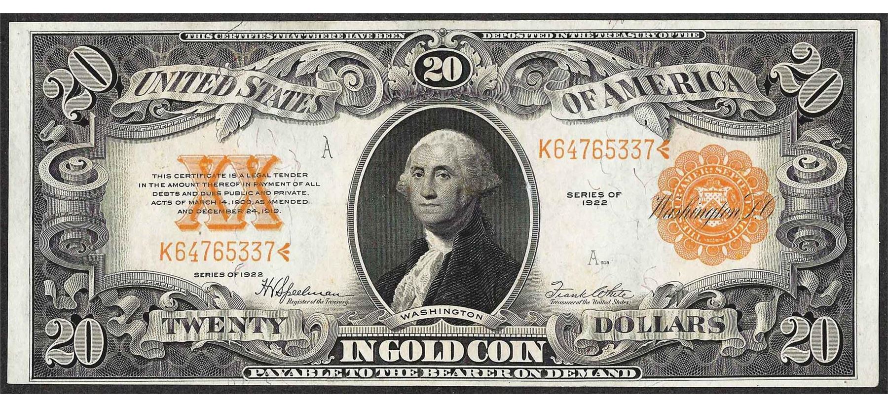 One 1922 $20 Gold Certificate Note.