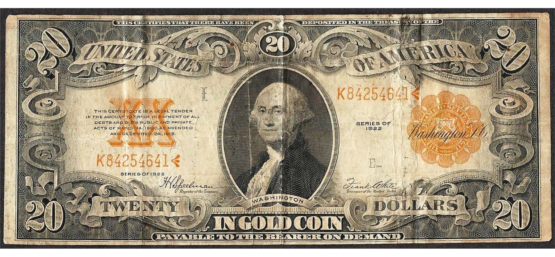 One 1922 $20 Gold Certificate Note.
