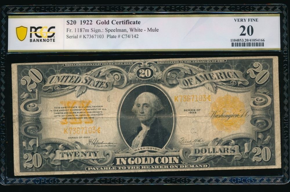 One 1922 $20 Gold Certificate PCGS 20.