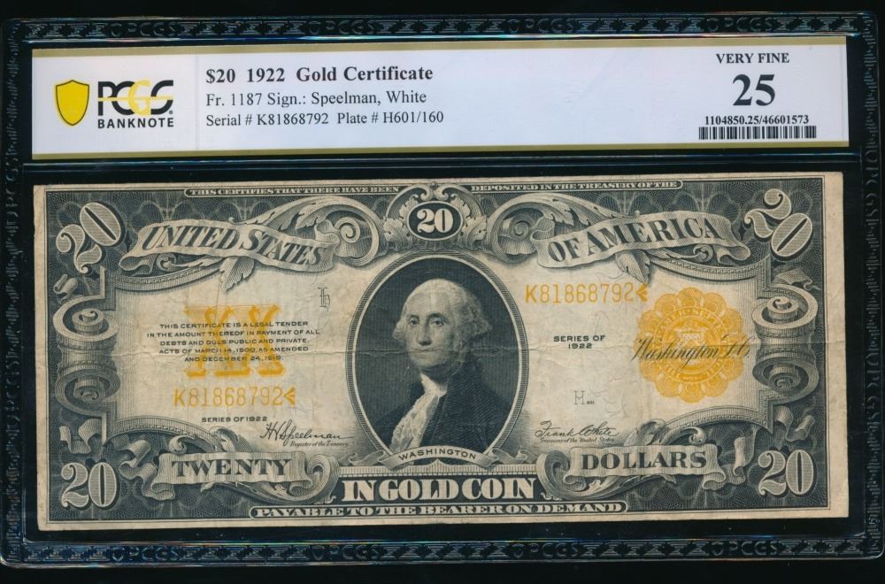 One 1922 $20 Gold Certificate PCGS 25.