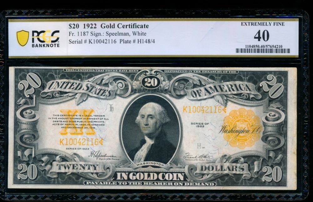 One 1922 $20 Gold Certificate PCGS 40.
