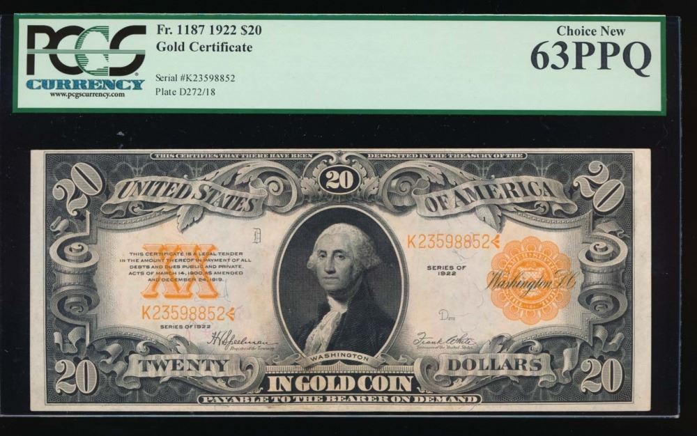 One 1922 $20 Gold Certificate PCGS 63PPQ.