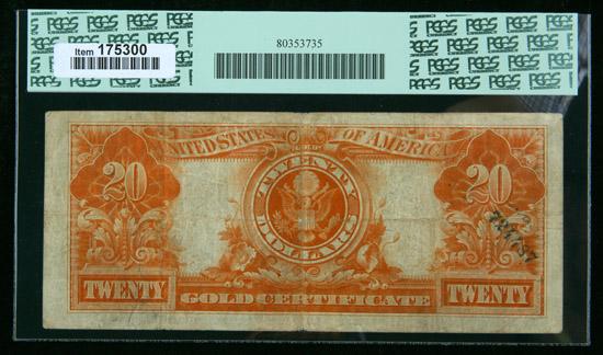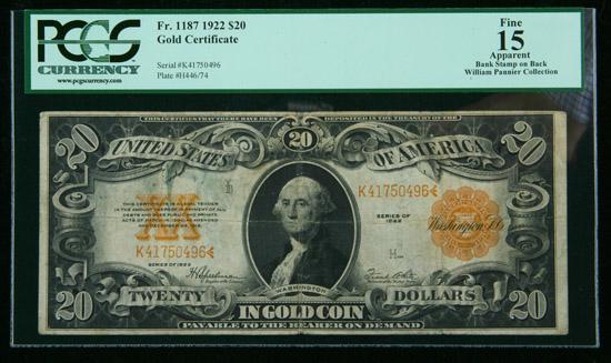 1922, $20 Gold Certificate. PCGS Apparent Fine 15. . Fr-1187. A small bank stamp on the back is the only flaw.