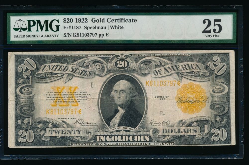 One 1922 $20 Gold Certificate PMG 25.