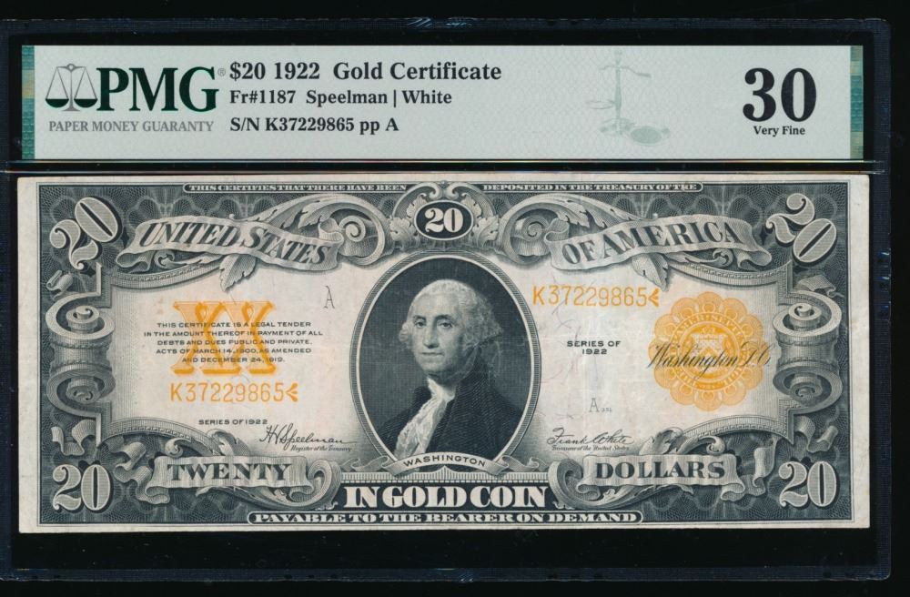 One 1922 $20 Gold Certificate PMG 30.