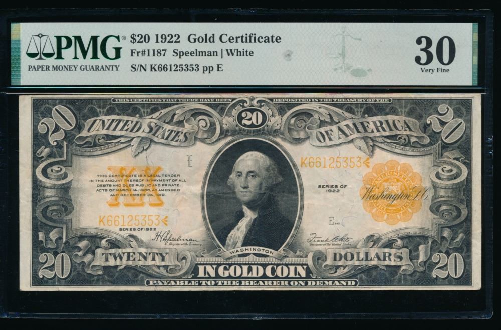 One 1922 $20 Gold Certificate PMG 30.