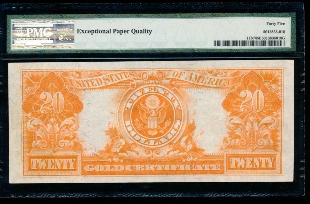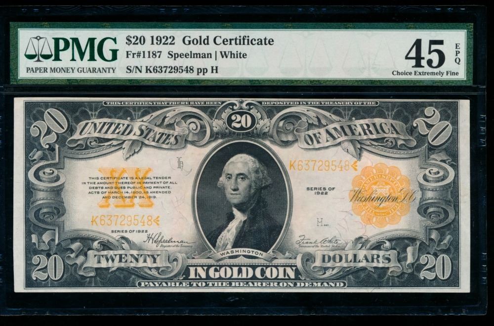 One 1922 $20 Gold Certificate PMG 45EPQ.