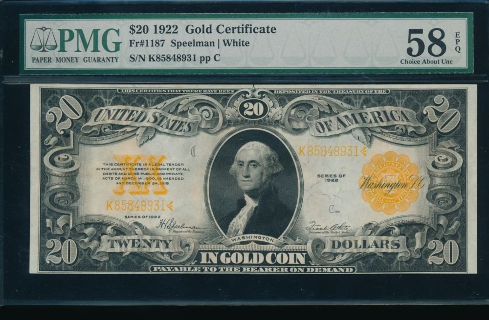 One 1922 $20 Gold Certificate PMG 58EPQ.