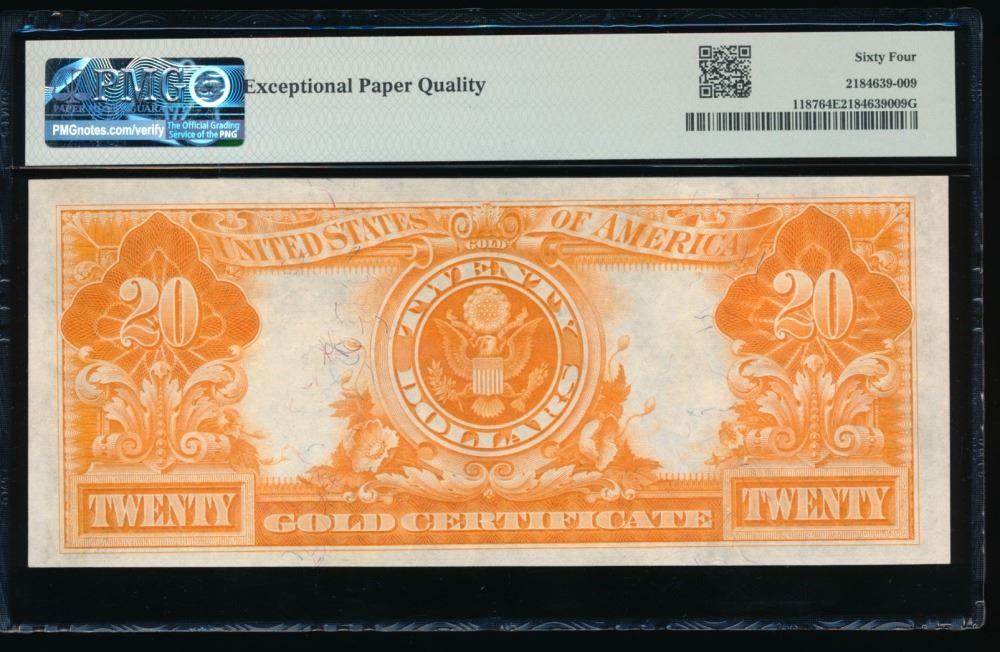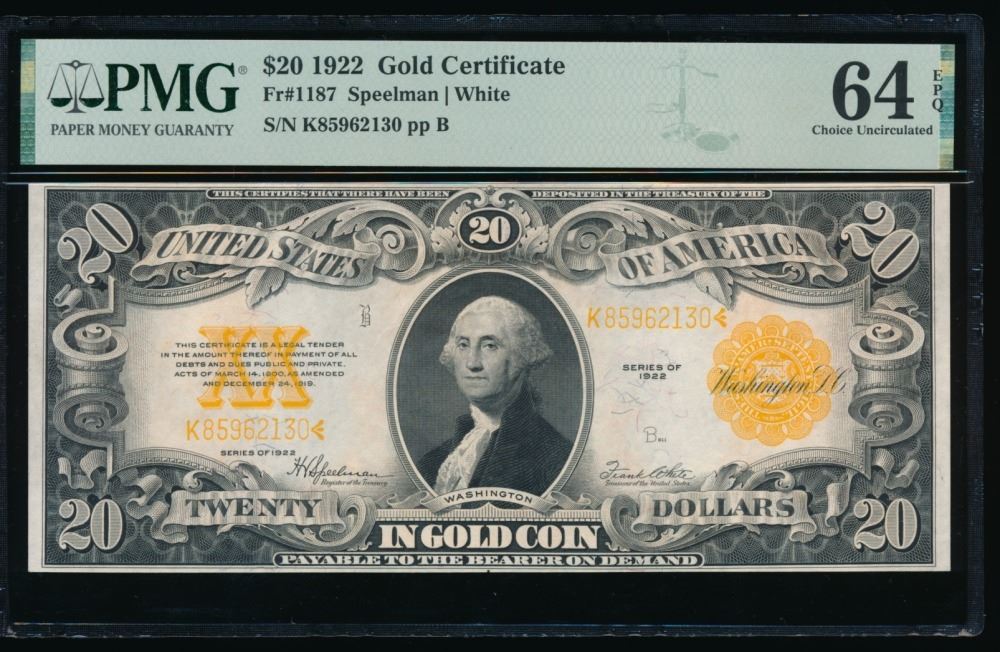 One 1922 $20 Gold Certificate PMG 64EPQ.