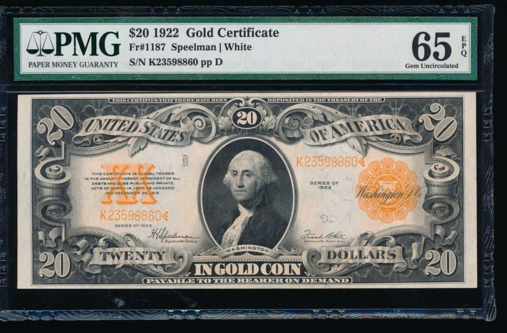 One 1922 $20 Gold Certificate PMG 65EPQ.