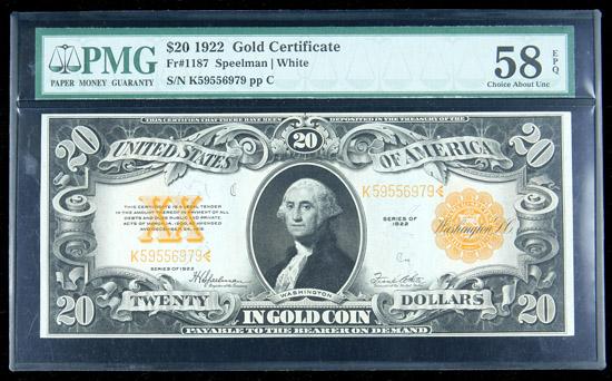 1922, $20 Gold Certificate. PMG Choice About Uncirculated 58EPQ. . Fr-1187. A single visible corner fold appears to be all that keeps this lovely Gold note from a higher grade.
