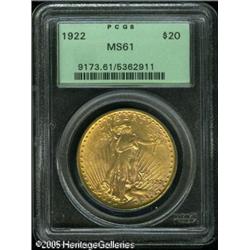 <B>1922 $20 MS61 PCGS.</B></I> An apricot-gold Double Eagle with vibrant luster and a number of small, non-distracting marks. Lot:9600