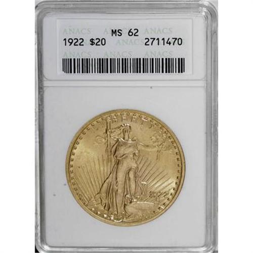 <B>1922 $20 MS62 ANACS.</B></I> NGC Census: (12643/21358). PCGS Population (8593/15007). Mintage: 1,375,500. Numismedia Wsl. Price for NGC/PCGS coin in MS62: $735. (#9173)<BR><BR><B>Coin Engraver:</B> Augustus Saint-Gaudens<BR><BR><b>Shipping:</b> Coins & Currency (<a target="_blank" href="http://www.heritageauctions.com/common/shipping.php">view shipping information</a>\)