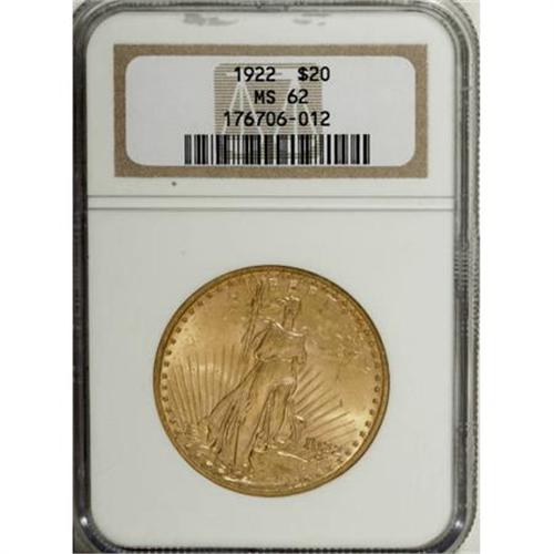<B>1922 $20 MS62 NGC.</B></I> NGC Census: (12673/21583). PCGS Population (8652/15593). Mintage: 1,375,500. Numismedia Wsl. Price for NGC/PCGS coin in MS62: $725. (#9173)<BR><BR><B>Coin Engraver:</B> Augustus Saint-Gaudens<BR><BR><b>Shipping:</b> Coins & Currency (<a target="_blank" href="http://www.heritageauctions.com/common/shipping.php">view shipping information</a>)