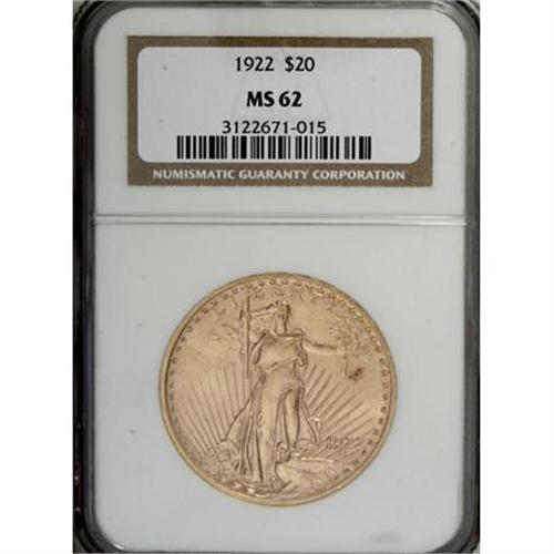 <B>1922 $20 MS62 NGC.</B></I> . NGC Census: (12986/22133). PCGS Population (8845/16430). Mintage: 1,375,500. Numismedia Wsl. Price for NGC/PCGS coin in MS62: $990. (#9173)<BR><BR><B>Coin Engraver:</B> Augustus Saint-Gaudens<BR><BR><b>Shipping:</b> Coins & Currency (<a target="_blank" href="http://www.heritageauctions.com/common/shipping.php">view shipping information</a>)