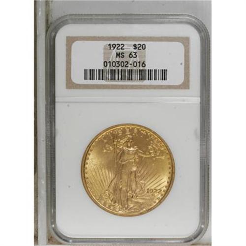 <B>1922 $20 MS63 NGC.</B></I> NGC Census: (15311/5986). PCGS Population (9391/5616). Mintage: 1,375,500. Numismedia Wsl. Price for NGC/PCGS coin in MS63: $740. (#9173)<BR><BR><b>Shipping:</b> Coins & Currency (<a target="_blank" href="http://www.heritageauctions.com/common/shipping.php">view shipping information</a>)