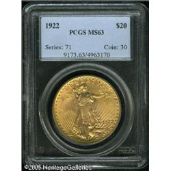 <B>1922 $20 MS63 PCGS.</B></I> A pleasing apricot-gold example that has a mark on the obverse rim before 12 o'clock but is otherwise choice. Lot:9608