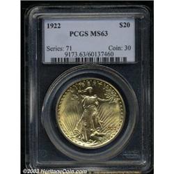 <TABLE cellSpacing=0 cellPadding=0 width="100%" bgColor=#000000 border=0><TBODY><TR><TD width="100%"><TABLE cellSpacing=1 cellPadding=3 width="100%" border=0><TBODY><TR><TD width="100%" bgColor=#79735c><FONT face=arial color=#ffffff size=3><B>Description</B> </FONT></TD></TR><TR><TD width="100%" bgColor=#ffffff><FONT face=arial size=2><B>1922 $20 MS63 PCGS.</B></I> Boldly struck with frosty bright yellow-gold surfaces that display a myriad of small contact marks on each side. </FONT></TD></TR></TBODY></TABLE></TD></TR></TBODY></TABLE><BR><A name=PricesRealized></A><TABLE cellSpacing=0 cellPadding=0 width="100%" bgColor=#000000 border=0><TBODY><TR><TD width="100%"><TABLE cellSpacing=1 cellPadding=3 width="100%" border=0><TBODY><TR><TD width="100%" bgColor=#79735c><A name=PR><FONT face=arial color=#ffffff size=3><B>Previous Prices from Heritage Auctions</B> </FONT></A></TD></TR><TR><TD bgColor=#f6f6ed><TABLE cellSpacing=0 cellPadding=0 width="100%" border=1><TBODY><TR><TD align=middle width="33%"><B>Date</B></TD><TD align=middle width="33%"><B>Service</B></TD><TD align=middle width="33%"><B>Price</B></TD></TR><TR bgColor=whitesmoke><TD width="33%"><B>09/28/2002</B></TD><TD width="33%">NGC</TD><TD width="33%">$419.75</TD></TR><TR bgColor=whitesmoke><TD width="33%"><B>07/17/2001</B></TD><TD width="33%">NGC</TD><TD width="33%">$380.00</TD></TR><TR bgColor=whitesmoke><TD width="33%"><B>06/02/2001</B></TD><TD width="33%">NGC</TD><TD width="33%">$379.50</TD></TR><TR bgColor=whitesmoke><TD width="33%"><B>02/12/1999</B></TD><TD width="33%">NGC</TD><TD width="33%">$546.25</TD></TR><TR bgColor=whitesmoke><TD width="33%"><B>11/21/1997</B></TD><TD width="33%">NGC</TD><TD width="33%">$467.50</TD></TR><TR bgColor=whitesmoke><TD width="33%"><B>09/10/1997</B></TD><TD width="33%">NGC</TD><TD width="33%">$440.00</TD></TR><TR bgColor=whitesmoke><TD width="33%"><B>06/03/1998</B></TD><TD width="33%">NGC</TD><TD width="33%">$506.00</TD></TR><TR bgColor=whitesmoke><TD width="33%"><B>11/21/1997</B></TD><TD width="33%">NGC</TD><TD width="33%">$467.50</TD></TR><TR bgColor=whitesmoke><TD width="33%"><B>09/10/2002</B></TD><TD width="33%">PCGS</TD><TD width="33%">$437.00</TD></TR><TR bgColor=whitesmoke><TD width="33%"><B>11/17/2000</B></TD><TD width="33%">PCGS</TD><TD width="33%">$391.00</TD></TR><TR bgColor=whitesmoke><TD width="33%"><B>02/05/1994</B></TD><TD width="33%">PCGS</TD><TD width="33%">$528.00</TD></TR><TR bgColor=whitesmoke><TD width="33%"><B>11/17/2000</B></TD><TD width="33%">PCGS</TD><TD width="33%">$437.00</TD></TR><TR bgColor=whitesmoke><TD width="33%"><B>02/11/2000</B></TD><TD width="33%">PCGS</TD><TD width="33%">$460.00</TD></TR><TR bgColor=whitesmoke><TD width="33%"><B>06/03/1994</B></TD><TD width="33%">PCGS</TD><TD width="33%">$577.50</TD></TR><TR bgColor=whitesmoke><TD width="33%"><B>03/03/2003</B></TD><TD width="33%">ANACS</TD><TD width="33%">$529.00</TD></TR><TR bgColor=whitesmoke><TD width="33%"><B>11/23/2002</B></TD><TD width="33%">NGC</TD><TD width="33%">$447.35</TD></TR><TR bgColor=whitesmoke><TD width="33%"><B>03/16/1996</B></TD><TD width="33%">ANACS</TD><TD width="33%">$506.00</TD></TR></TBODY></TABLE></TD></TR><TR><TD bgColor=#ffffff><FONT face=arial size=1 ?>PLEASE NOTE: All prices realized reflect the final hammer price PLUS the buyer's premium in auctions that charge a buyer's premium. Each item has a notation at the top of the listing indicating whether that lot included a buyer's premium. Example: A item that sells with a final hammer price of $100 and a 20% buyer's premium will display with a price realized of $120. All information listed is intended to be as accurate as possible, but errors are possible. Please use this guide carefully and inform us of any inaccuracies. </FONT></TD></TR></TBODY></TABLE></TD></TR></TBODY></TABLE><BR><TABLE cellSpacing=0 cellPadding=0 width="100%" bgColor=#000000 border=0><TBODY><TR><TD width="100%"><TABLE cellSpacing=1 cellPadding=3 width="100%" border=0><TBODY><TR><TD width="100%" bgColor=#79735c colSpan=6><FONT face=arial color=#ffffff size=3><B>Price Guide*</B> </FONT></TD></TR><TR bgColor=#f6f6ed><TD align=middle><B>Grade</B> </TD><TD align=middle><B>Coin World<BR>(Trends)</B> </TD><TD align=middle><B>Numismedia<BR>Retail</B> </TD><TD align=middle><B>Numismedia<BR>Wholesale</B> </TD><TD align=middle><B>Coin<BR>Universe</B> </TD><TD align=middle><B>Heritage<BR>Value Index</B> </TD></TR><TR bgColor=#ffffff><TD align=middle>62</TD><TD align=right>$550.00</TD><TD align=right>$575.00</TD><TD align=right>$479.00</TD><TD align=right>$535.00</TD><TD align=right>$404.50</TD></TR><TR style="FONT-WEIGHT: bold" bgColor=#cccfdd><TD align=middle>63</TD><TD align=right>$575.00</TD><TD align=right>$640.00</TD><TD align=right>$510.00</TD><TD align=right>$590.00</TD><TD align=right>$429.63</TD></TR><TR bgColor=#ffffff><TD align=middle>64</TD><TD align=right>$650.00</TD><TD align=right>$730.00</TD><TD align=right>$585.00</TD><TD align=right>$865.00</TD><TD align=right>$564.13</TD></TR><TR bgColor=#ffffff><TD colSpan=6><FONT size=1>*All information listed is intended to be as accurate as possible, but errors are possible. No item may be returned or refused based on this information which is provided as a service to our customers. You should contact each pricing source directly to determine the accuracy of this information. </FONT></TD></TR></TBODY></TABLE></TD></TR></TBODY></TABLE><BR><TABLE cellSpacing=0 cellPadding=0 width="100%" bgColor=#000000 border=0><TBODY><TR><TD width="100%"><TABLE cellSpacing=1 cellPadding=3 width="100%" border=0><TBODY><TR><TD width="100%" bgColor=#79735c><FONT face=arial color=#ffffff size=3><B>Population Guide</B> </FONT></TD></TR><TR bgColor=#ffffff><TD align=middle><!-- Begin Output of Population Grid--><TABLE cellSpacing=0 cellPadding=0 width="100%" border=0><TBODY><TR><TD vAlign=center><TABLE cellSpacing=0 width="100%" border=1 cellsadding="3"><TBODY><TR><TD vAlign=center><TABLE cellSpacing=0 cellPadding=3 width="100%" border=1><TB