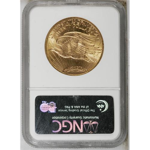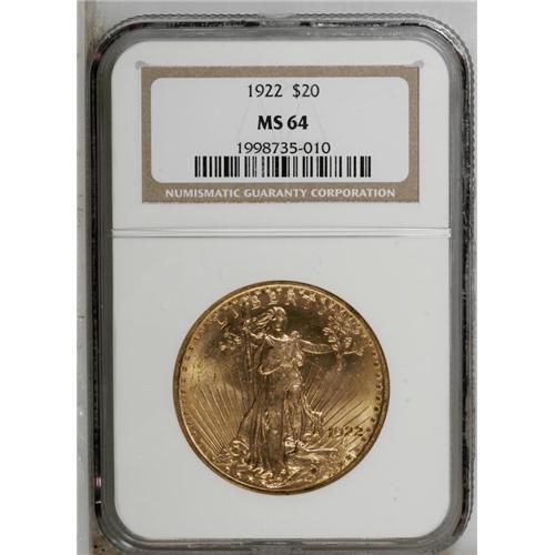 <B>1922<$20> MS64 NGC.</B></I> A shining near-Gem that has excellent definition on the devices. Scattered marks in the fields and on Liberty's legs account for the grade.