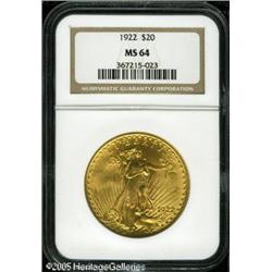 <B>1922 $20 MS64 NGC.</B></I> Both sides display a vibrant, satiny appearance and are temptingly close to MS65 quality. An original combination of pink-gold centers and antique-golden peripheral luster is seen on each side. Scarce in high grades.<BR><I>From The Richard J. Chouinard Collection of United States Coins, Part Two.</B></I> Lot:9609