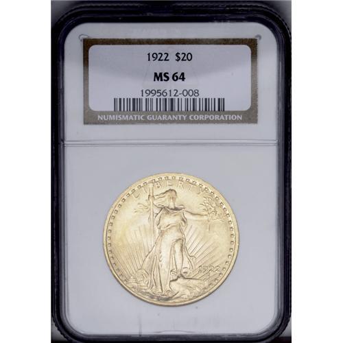 1922 $20 MS64 NGC. Bright, even golden-orange colorati 1922[$20] MS64 NGC.