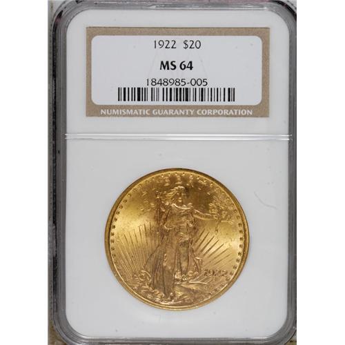 <B>1922 $20 MS64 NGC.</B></I> Frosty and highly lustrous yellow-gold surfaces on both sides of this sharp piece create excellent eye appeal. This date is nearly as common as the later P-mint issues through 1928, available in all grades through MS65.<BR><BR><b>Shipping:</b> Coins & Currency (<a target="_blank" href="http://www.heritageauctions.com/common/shipping.php">view shipping information</a>)