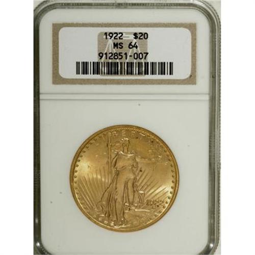 <B>1922 $20 MS64 NGC.</B></I> NGC Census: (5547/439). PCGS Population (4673/943). Mintage: 1,375,500. Numismedia Wsl. Price for NGC/PCGS coin in MS64: $920. (#9173)<BR><BR><b>Shipping:</b> Coins & Currency (<a target="_blank" href="http://www.heritageauctions.com/common/shipping.php">view shipping information</a>)