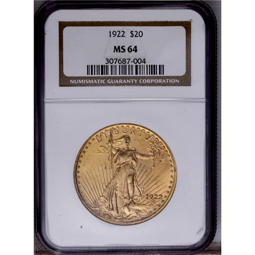 <B>1922<$20> MS64 NGC.</B></I> Nice luster exudes from honey-gold surfaces, and the design elements are well brought up. A few minor marks just barely prevent a higher grade. <BR><BR><B>Important notice:</B> Heritage usually auctions material at the rate of 200-250 lots per hour. On some occasions eBay Live bid software or the Internet may not be able to keep up with the pace of the auction. We recommend placing a realistic absentee bid now as insurance to avoid disappointment. Occasionally the auctioneer may eliminate or reject an eBay Live bid, and the auctioneer may also reopen a lot after the close of the eBay live bidding (usually because we missed an audience bid), and may reject your bid even if it shows you as the winning bidder. By bidding via eBay Live, you agree that Heritage may award the lot to another bidder at its sole discretion under the circumstances described above or any other reasonable circumstances. Since eBay bids are not shown to us until we open the lot on the floor, we treat those bids just like floor bids. In most cases the floor responds before the eBay bid is presented to us, due to Internet lag time, so for consistency we have made it a policy that floor bids are always considered first over tie eBay live bids. Also please note that all Heritage lots purchased through eBay Live carry a 20% Buyer's Premium. Please make sure you read the Terms and Conditions before you bid. This lot is being auctioned in conjunction with a live floor auction by Heritage Galleries & Auctioneers. All final auction and invoice information will be supplied by Heritage Galleries & Auctioneers, and all other information should be considered preliminary. Lot:4668 <BR><BR><B>Winning Notification and Billing:</B> After the FINAL session in this auction is complete, Heritage will send e-mail and snail mail invoices. This process normally takes several days. All final auction and invoice information will be supplied by Heritage Galleries & Auctioneers, and all other information should be considered preliminary. <BR><BR>This auction will be conducted on a live auction floor and over the Internet through eBay Live. If you choose to place an absentee bid, please take a moment to <font color='#0000ff'><u><a href='http://pages.ebay.com/liveauctions/help/before/laabsentee.html'>learn how eBay Live absentee bidding works</a></u></font><font color='#000000'>