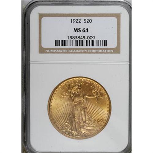 <B>1922 $20 MS64 NGC.</B></I> NGC Census: (5730/449). PCGS Population (5272/1051). Mintage: 1,375,500. Numismedia Wsl. Price for NGC/PCGS coin in MS64: $920. (#9173)<BR><BR><B>Coin Engraver:</B> Augustus Saint-Gaudens<BR><BR><b>Shipping:</b> Coins & Currency (<a target="_blank" href="http://www.heritageauctions.com/common/shipping.php">view shipping information</a>)