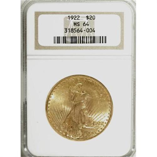 <B>1922 $20 MS64 NGC.</B></I> NGC Census: (5792/467). PCGS Population (5358/1062). Mintage: 1,375,500. Numismedia Wsl. Price for NGC/PCGS coin in MS64: $1,060. (#9173)<BR><BR><B>Coin Engraver:</B> Augustus Saint-Gaudens<BR><BR><b>Shipping:</b> Coins & Currency (<a target="_blank" href="http://www.heritageauctions.com/common/shipping.php">view shipping information</a>)