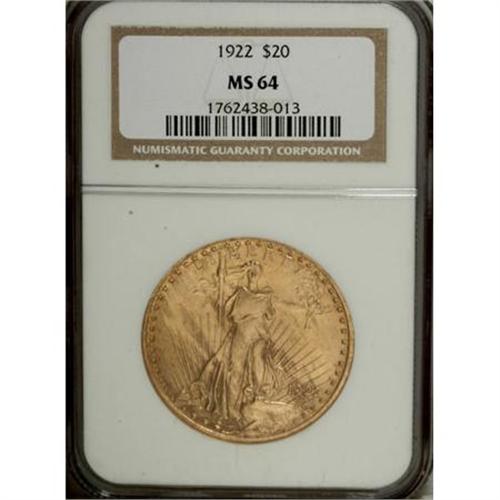 <B>1922 $20 MS64 NGC.</B></I> NGC Census: (5854/482). PCGS Population (5557/1077). Mintage: 1,375,500. Numismedia Wsl. Price for NGC/PCGS coin in MS64: $1,235. (#9173)<BR><BR><B>Coin Engraver:</B> Augustus Saint-Gaudens<BR><BR><b>Shipping:</b> Coins & Currency (<a target="_blank" href="http://www.heritageauctions.com/common/shipping.php">view shipping information</a>)