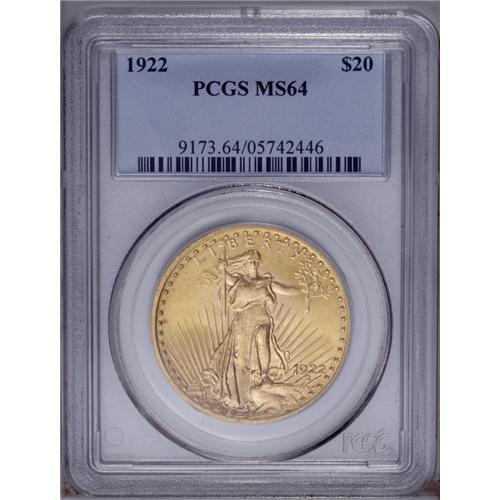 <B>1922<$20> MS64 PCGS.</B></I> An uncommonly fine coin for the grade with no noticeable abrasions on either side. The soft, satiny mint luster has even orange-gold coloration.