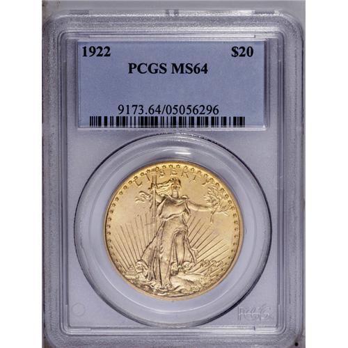 <B>1922<$20> MS64 PCGS.</B></I> Attractive brass-gold color with bright, radiant luster. The design elements are crisply struck, further enhancing the eye appeal of this magnificent piece. Just a mark or two from full Gem.