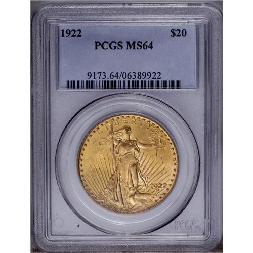 <B>1922<$20> MS64 PCGS.</B></I> Bright peach-gold patina overlays lustrous surfaces that display sharply struck design elements. A couple of small marks are noted in the right obverse field.