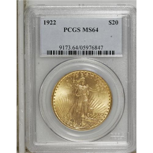 <B>1922 $20 MS64 PCGS.</B></I> Choice and attractive with lovely luster. A number of tiny ticks are present in the slightly frosty fields, though a handful of marks on Liberty's legs are grade-defining.<BR><BR><b>Shipping:</b> Coins & Currency (<a target="_blank" href="http://www.heritageauctions.com/common/shipping.php">view shipping information</a>)