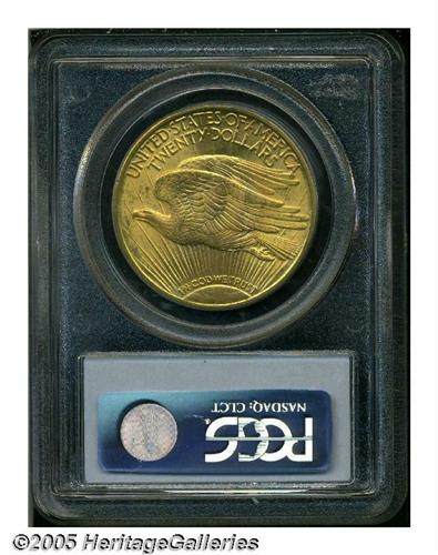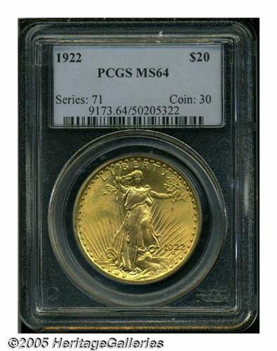 <B>1922<$20> MS64 PCGS.</B></I> Lustrous surfaces display peach-gold patination that exhibits subtle hints of lime green undertones, and the design elements are sharply impressed. A few minute marks on Liberty's figure and on the eagle are consistent with the grade.