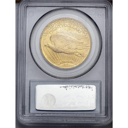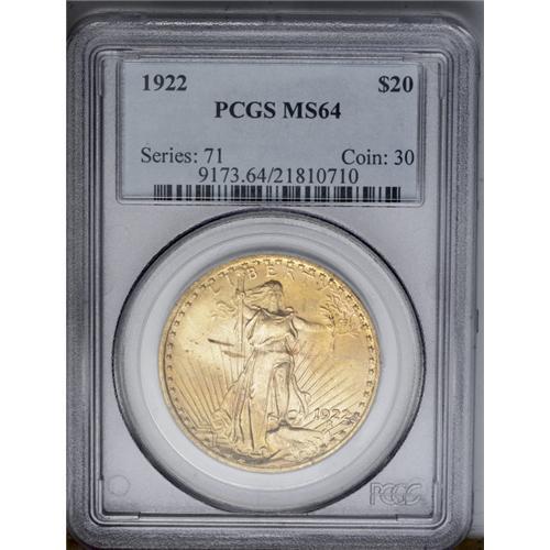 <B>1922<$20> MS64 PCGS.</B></I> Mint-green and peach-gold coloration with shimmering luster and no large marks. A reddish-brown horizontal toning streak crosses the obverse center, and a few flyspecks are observed near the reverse borders.
