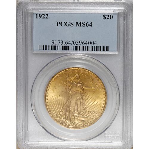 <B>1922 $20 MS64 PCGS.</B></I> PCGS Population (4594/947). NGC Census: (5477/432). Mintage: 1,375,500. Numismedia Wsl. Price: $920. (#9173)<BR><BR><b>Shipping:</b> Coins & Currency (<a target="_blank" href="http://www.heritageauctions.com/common/shipping.php">view shipping information</a>)