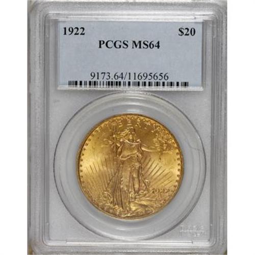 <B>1922 $20 MS64 PCGS.</B></I> PCGS Population (4673/943). NGC Census: (5547/439). Mintage: 1,375,500. Numismedia Wsl. Price for NGC/PCGS coin in MS64: $920. (#9173)<BR><BR><b>Shipping:</b> Coins & Currency (<a target="_blank" href="http://www.heritageauctions.com/common/shipping.php">view shipping information</a>)