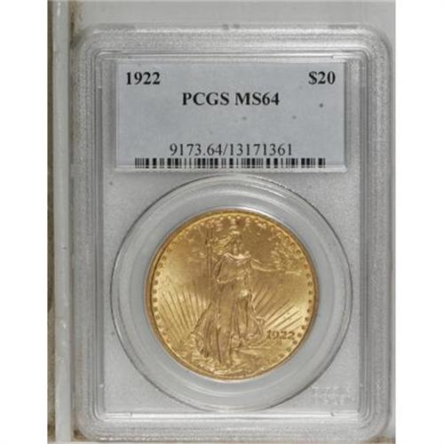 <B>1922 $20 MS64 PCGS.</B></I> PCGS Population (4673/943). NGC Census: (5547/439). Mintage: 1,375,500. Numismedia Wsl. Price for NGC/PCGS coin in MS64: $920. (#9173)<BR><BR><b>Shipping:</b> Coins & Currency (<a target="_blank" href="http://www.heritageauctions.com/common/shipping.php">view shipping information</a>)