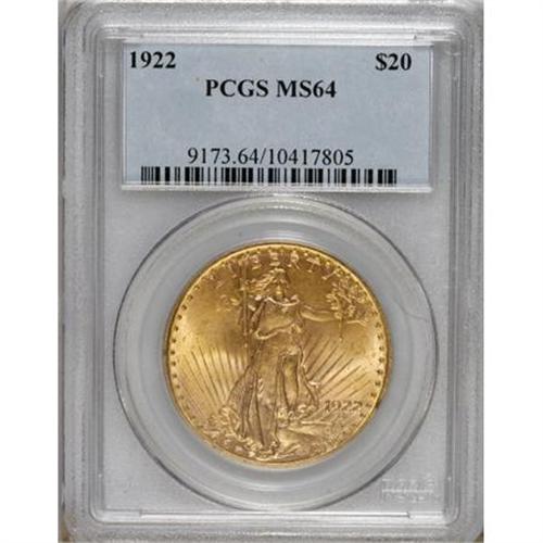 <B>1922 $20 MS64 PCGS.</B></I> PCGS Population (4673/943). NGC Census: (5547/439). Mintage: 1,375,500. Numismedia Wsl. Price for NGC/PCGS coin in MS64: $920. (#9173)<BR><BR><b>Shipping:</b> Coins & Currency (<a target="_blank" href="http://www.heritageauctions.com/common/shipping.php">view shipping information</a>)